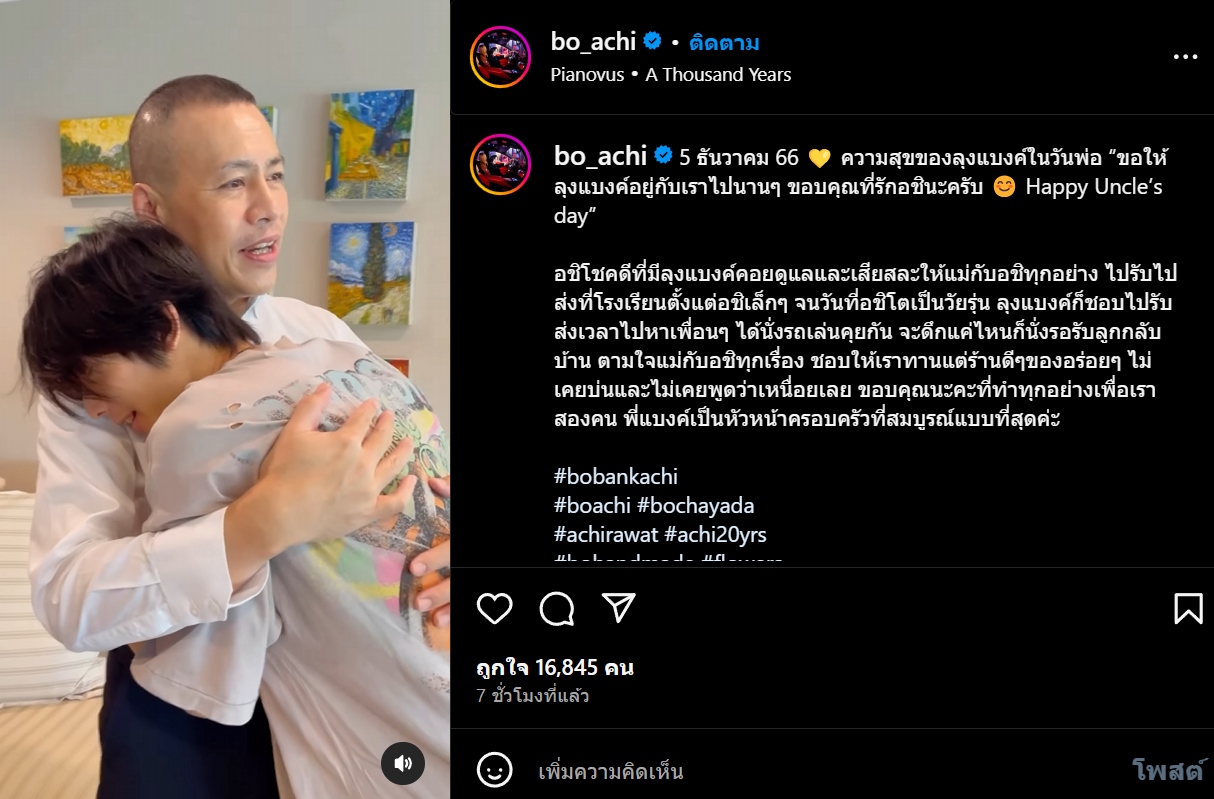 5 ธันวาคม 66 💛 ความสุขของลุงแบงค์ในวันพ่อ “ขอให้ลุงแบงค์อยู่กับเราไปนานๆ ขอบคุณที่รักอชินะครับ 😊 Happy Uncle’s day” อชิโชคดีที่มีลุงแบงค์คอยดูแลและเสียสละให้แม่กับอชิทุกอย่าง ไปรับไปส่งที่โรงเรียนตั้งแต่อชิเล็กๆ จนวันที่อชิโตเป็นวัยรุ่น ลุงแบงค์ก็ชอบไปรับส่งเวลาไปหาเพื่อนๆ