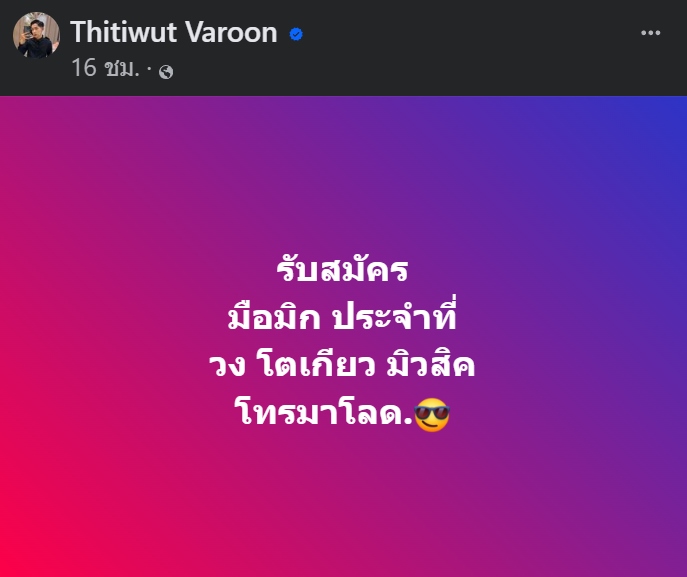 โดยล่าสุด ทางด้าน บิ๊ก ธิติวุฒิ ได้ออกมาประกาศข่าวดีแล้วจ้าระบุว่า รับสมัครมือมิก ประจำที่วง โตเกียว มิวสิค โทรมาโลด.😎