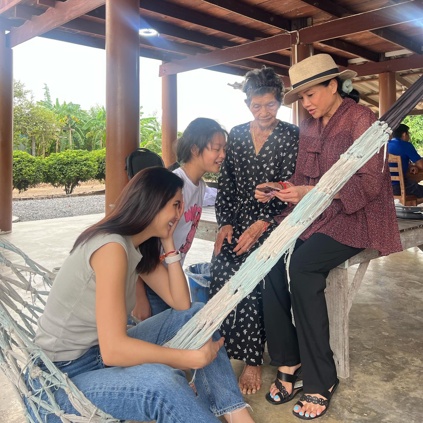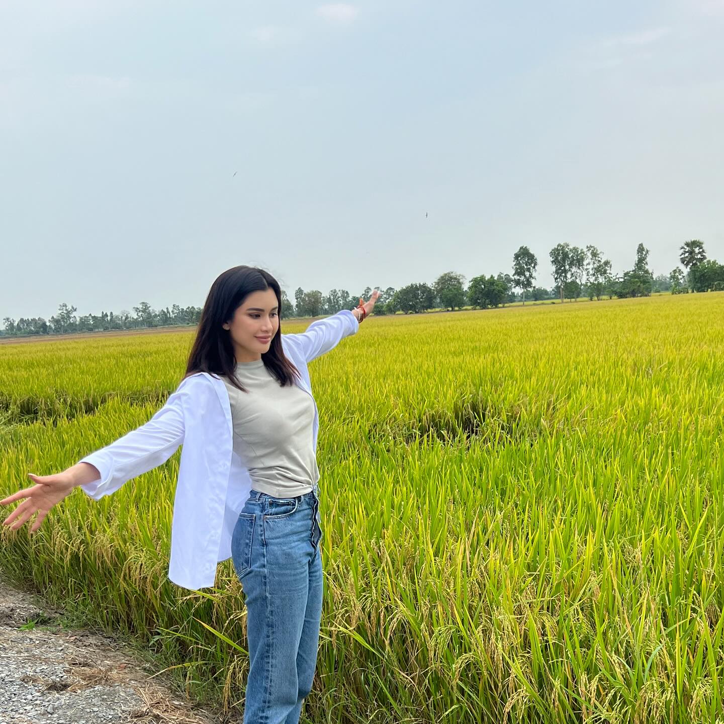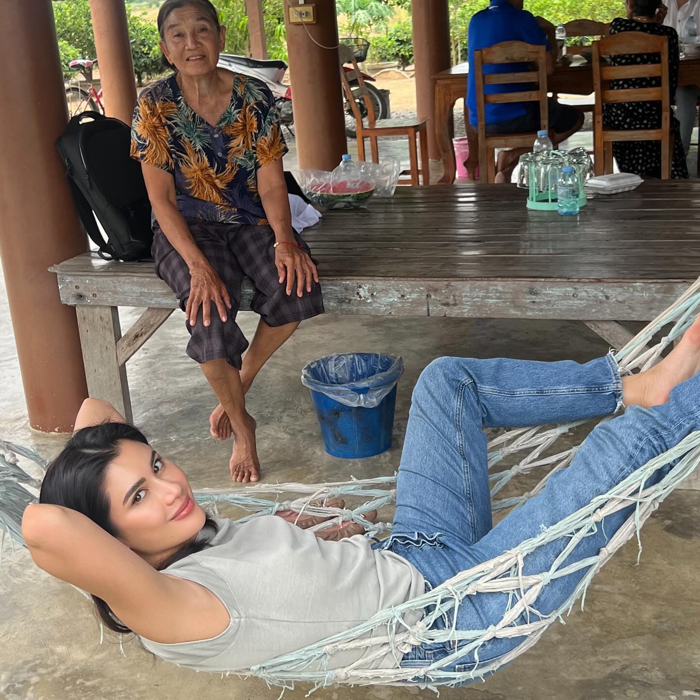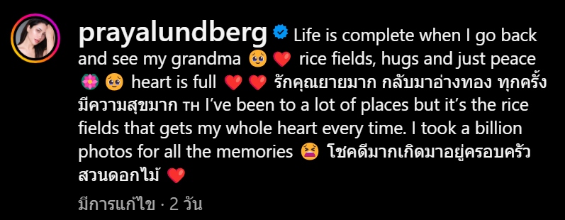 ล่าสุดได้กลับมาอีกครั้งพร้อมเผยความรู้สึกว่า Life is complete when I go back and see my grandma 🥹❤️ rice fields, hugs and just peace 🪷🥹 heart is full ❤️❤️ รักคุณยายมาก กลับมาอ่างทอง ทุกครั้งมีความสุขมาก 🇹🇭 I’ve been to a lot of places but it’s the rice fields that gets my whole heart every time. I took a billion photos for all the memories 😫 โชคดีมากเกิดมาอยู่ครอบครัวสวนดอกไม้ ❤️