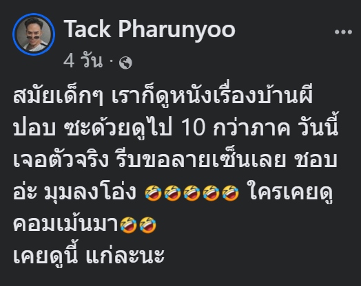 ล่าสุดทางด้าน แทคภรัณยู ได้ออกมาโพสต์ภาพคู่กันอีกครั้งพร้อมระบุข้อความว่า “สมัยเด็กๆ เราก็ดูหนังเรื่องบ้านผี ปอบ ซะด้วยดูไป 10 กว่าภาค วันนี้เจอตัวจริง รีบขอลายเซ็นเลย ชอบอ่ะ มุมลงโอ่ง ใครเคยดู คอมเม้นมา เคยดูนี้ แก่ละนะ” แม้อายุ 75 ปีแล้ว ยังดูไม่แก่เลย