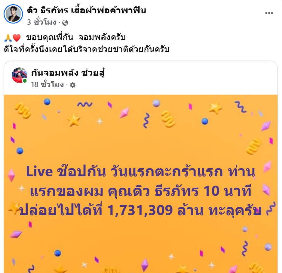 Live ช๊อปกัน วันแรกตะกร้าแรก ท่านแรกของผม คุณดิว ธีรภัทร 10 นาทีปล่อยไปได้ที่ 1,731,309 ล้าน ทะลุครับ