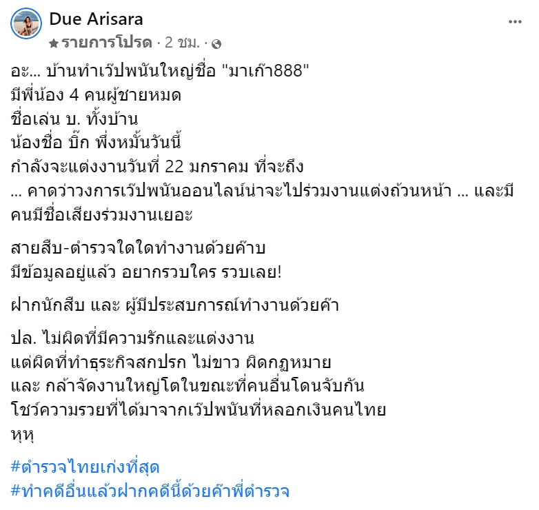 อยู่ดีๆก็ทำเอาหลายคนถึงกับช็อค หลังจากที่นักแสดงสาว “ดิว อริสรา” ทิ้งบอมลูกใหญ่ ออกมาชี้เบาใส่ให้ตำรวจจับเจ้าของเว็บพนัน รายใหญ่เครือข่าย “มาเก๊า 888”