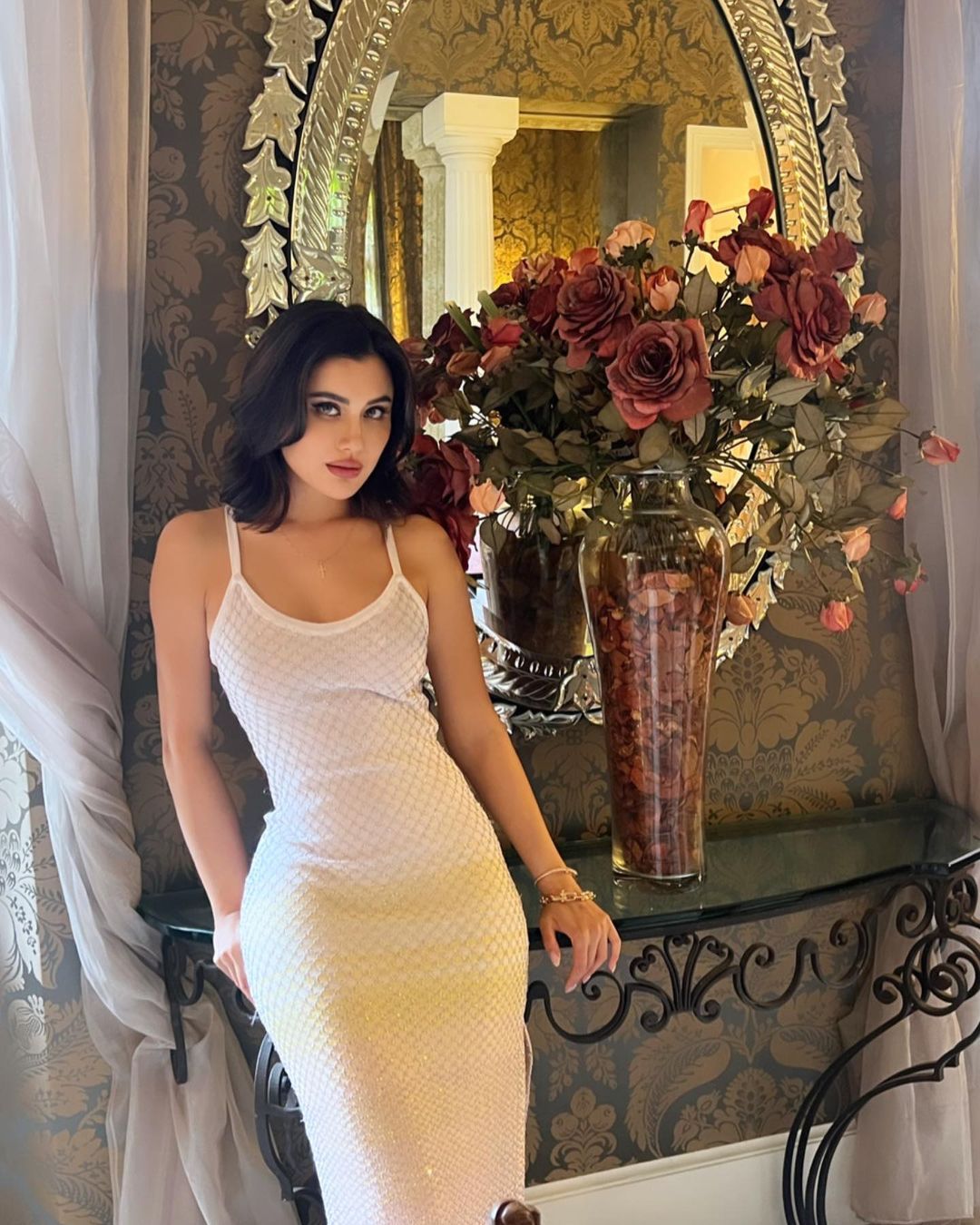 เฉิดฉายออร่าในชุดสีขาวซีทรูรัดรูป ที่ต้องบอกเลยว่าภาพช็อตนี้ของสาวปูนั้น มีความสวยเซ็กซี่ตั้งแต่หัวจรดเท้า เห็นแล้วใจบางไม่ไหว ไม่รู้จะโฟกัสตรงไหนก่อนดีเพราะน่ามองไปหมด