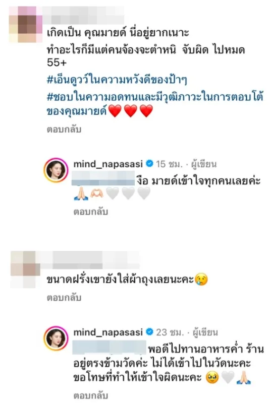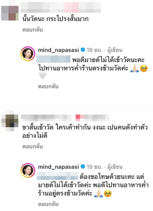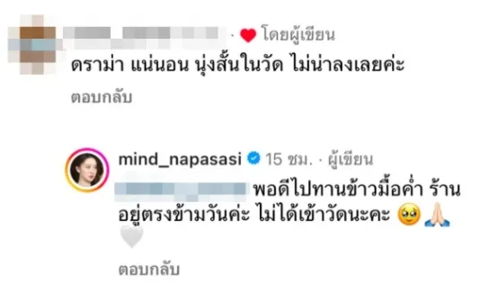 แต่หลังจากที่โพสต์นี้เผยออกมาก็ทำเอาชาวเน็ตบางกลุ่มไม่พอใจ เข้ามาคอมเม้นท์ถึงความไม่เหมาะสมกันยกใหญ่ กับชุดที่มายด์ใส่และสถานที่ที่เธอยืนเต้น นั่นก็คือวัด ซึ่งหลายคนคิดว่าการใส่เดรสสั้นสีดำที่วัดนั้นไม่เหมาะสมกับบรรยากาศที่เป็นสถานที่ศักดิ์สิทธิ์ จากนั้นสาวมายด์ก็รีบเข้ามาตอบกลับคอมเม้นท์ดราม่าต่างๆทันที ชี้แจ้งว่า “พอดีไปทานข้าวมื้อค่ำ ร้านอยู่ตรงข้ามวัดค่ะ ไม่ได้เข้าวัดนะคะ ขอโทษที่ทำให้เข้าใจผิดนะคะ”