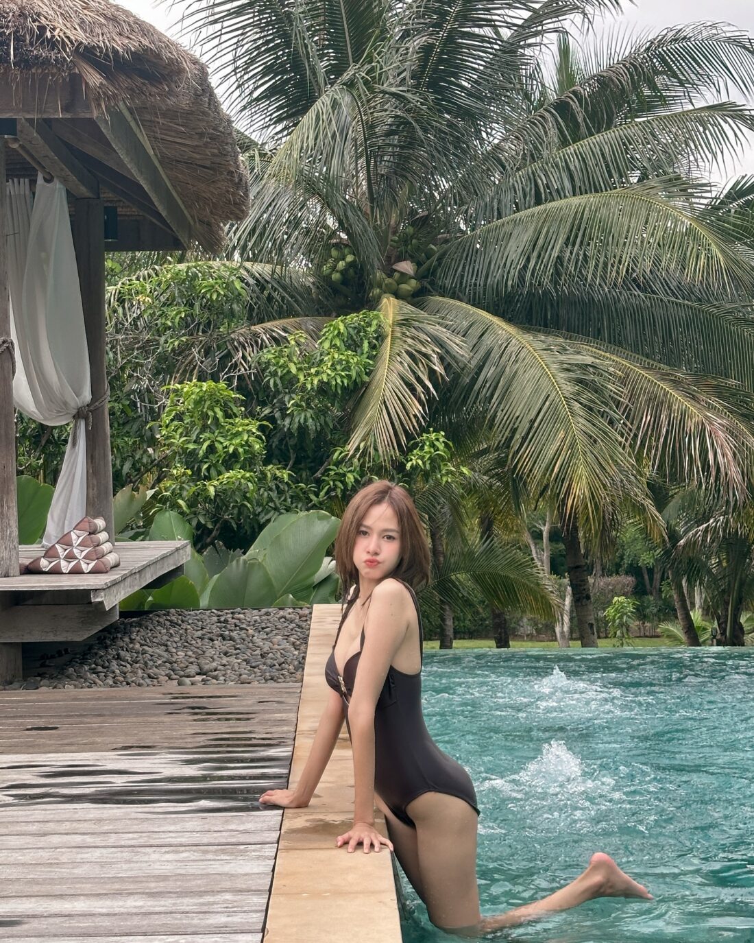 ส่งตรงความสวยและความแซ่บผ่านชุดว่ายน้ำวันพีชสีน้ำตาล โชว์ผิวขาวจั๊วะริมสระว่ายน้ำ แต่ละช็อตสวยเกินห้ามใจ