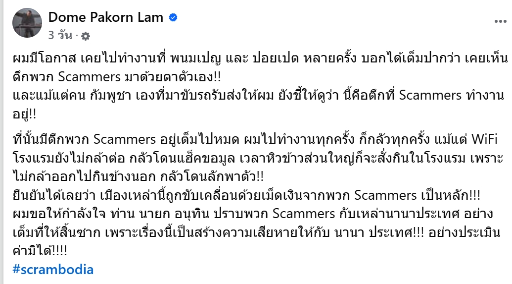 เป็นที่ทราบกันดีว่า โดม ปกรณ์ ลัม นักร้อง-ดาราหนุ่ม ได้โพสต์เล่าเรื่องราวช่วงที่ทำงานในประเทศกัมพูชา ตนรู้สึกกลัวมิจฉาชีพและเห็นตึกของแก๊งสแกมเมอร์อยู่เต็มไปหมด ทำให้ไม่กล้าออกจากโรงแรม แม้แต่การเชื่อมต่อ WiFi ก็ยังไม่กล้าทำ.