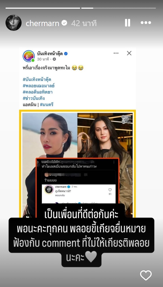 แต่ดูเหมือนว่าในโซเชียลจะมีคนตีความไปไกลจนเกิดการคอมเมนต์โยงประเด็นต่าง ๆ ทำให้ล่าสุด พลอย ต้องออกมาเคลื่อนไหวชี้แจงผ่านโซเชียลอีกครั้ง โดยระบุว่า “เป็นเพื่อนที่ดีต่อกันค่ะ พอนะคะทุกคน พลอยขี้เกียจยื่นหมายฟ้องกับคอมเมนต์ที่ไม่ให้เกียรติพลอยนะคะ”