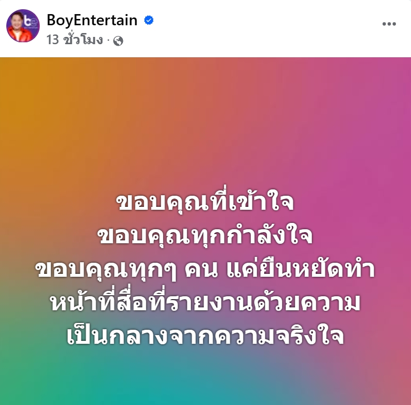 เมื่อวานนี้ บอย ฐิติกร ผู้สื่อข่าวมากประสบการณ์ ได้ออกมาโพสต์ข้อความผ่านโซเชียลส่วนตัว “ขอบคุณที่เข้าใจ ขอบคุณทุกกำลังใจ ขอบคุณทุกๆ คน แค่ยืนหยัดทำหน้าที่สื่อที่รายงานด้วยความเป็นกลางจากความจริงใจ”