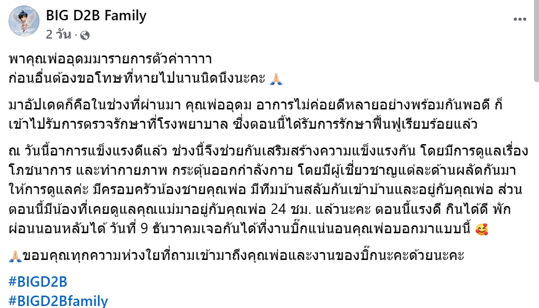 ล่าสุดมีรายงานว่า เมื่อเพจ BIG D2B Family ได้ออกมาอัปเดตความเคลื่อนไหวของ คุณพ่ออุดม หลังห่างหายจากโลกออนไลน์ไปสักพักใหญ่ ทำเอาเหล่าแฟนคลับยังคงติดตามและเป็นห่วงอยู่เสมอ ทำให้แฟนคลับหลานท่านสบายใจ
