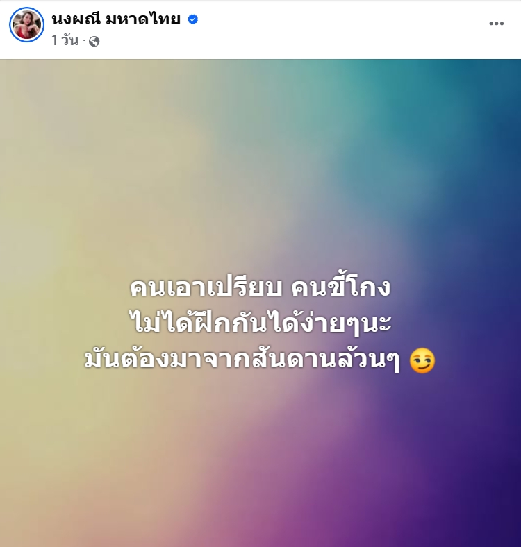 ทำเอาวงการบันเทิงลุกเป็นไฟ เมื่อวันที่ 4 พฤศจิกายน 2568 นักร้องสาวลูกทุ่งชื่อดัง จ๊ะ นงผณี มหาดไทย ได้โพสต์ข้อความร้อนแรงผ่านโซเชียล โดยมีใจความถึงเรื่องคน “เอาเปรียบ” และ “ขี้โกง” พร้อมระบุชัดว่า พฤติกรรมแบบนี้ไม่ได้ฝึกกันง่ายๆ แต่เป็นเรื่องของ “สันดาน” ล้วนๆ