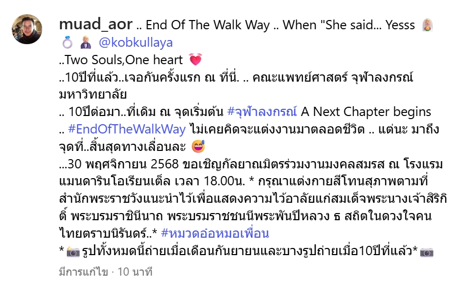 โดยหมวดอ๋อได้เขียนถึงความทรงจำและเส้นทางความรักตลอด 10 ปีว่า “10 ปีที่แล้ว…เจอกันครั้งแรก ณ ที่นี่ คณะแพทยศาสตร์ จุฬาลงกรณ์มหาวิทยาลัย 10 ปีต่อมา…ที่เดิม ณ จุดเริ่มต้น #จุฬาลงกรณ์ A Next Chapter begins #EndOfTheWalkWay ไม่เคยคิดจะแต่งงานมาตลอดชีวิต… แต่นะ มาถึงจุดที่…สิ้นสุดทางเลื่อนละ 😅”