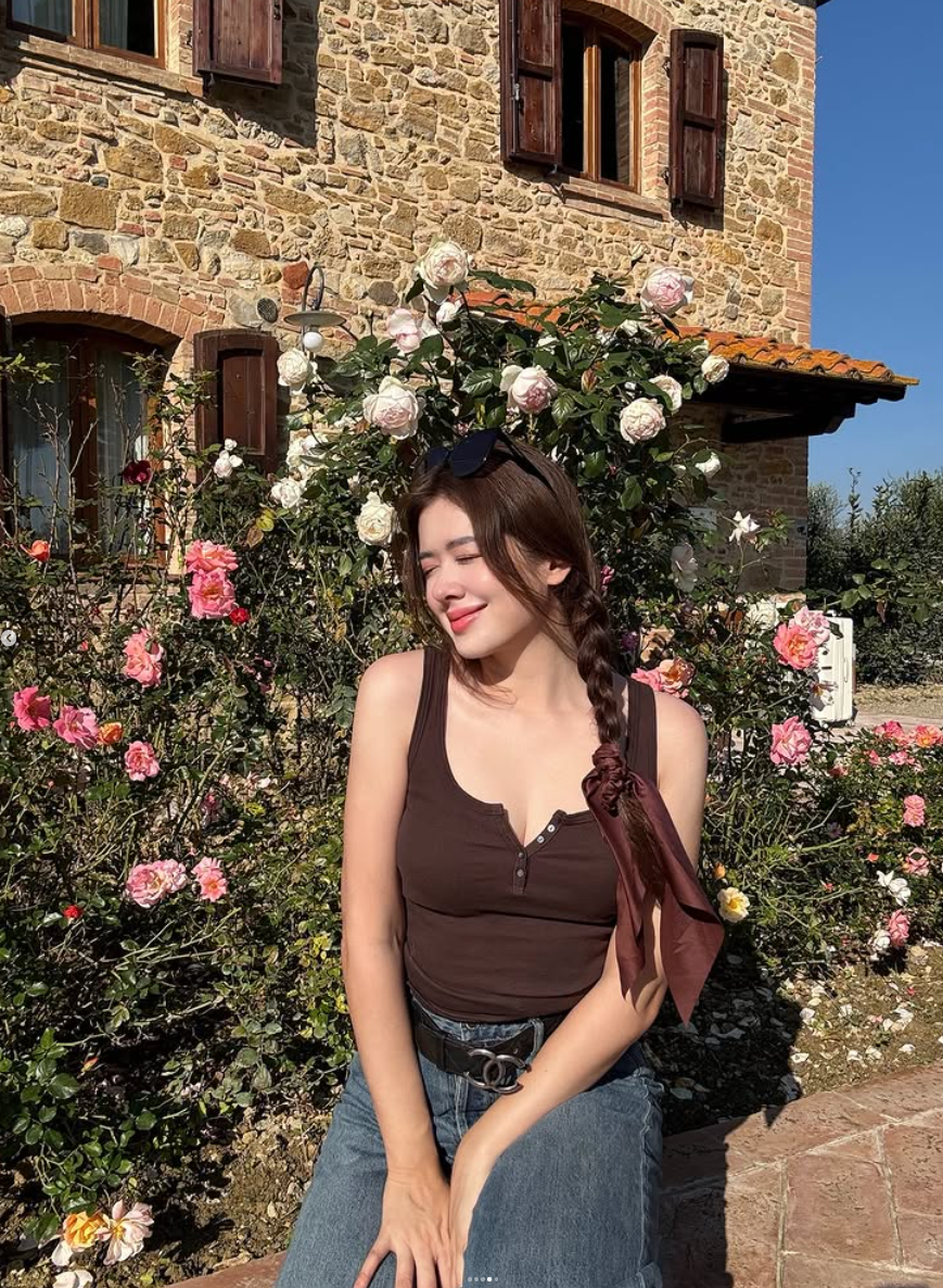 ทริปนี้ มิ้นท์มาในลุคชิล ๆ แต่ดูดีเกินต้าน กับเสื้อกล้ามรัดรูปสีน้ำตาลแมตช์กับกางเกงยีนส์ขายาว โชว์สัดส่วนได้สวยพอดี พร้อมผิวขาวเนียนที่สะท้อนแสงแดดอุ่น ๆ ของทัสคานี่ ทำให้ภาพทุกช็อตดูสบายตา แต่ก็ชวนใจสั่นไม่น้อย