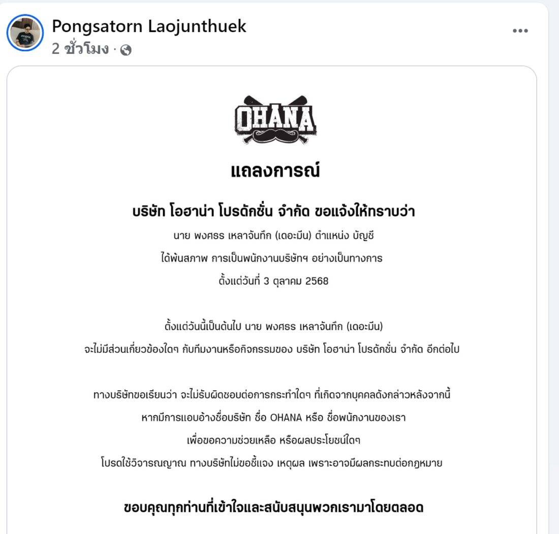 เป็นประเด็นที่แฟนคลับใจหาย เมื่อทางช่องคอนเทนต์ชื่อดัง OHANA ได้ออกแถลงการณ์อย่างเป็นทางการ ระบุว่า “เดอะมีน” พ้นสภาพการเป็นพนักงานของบริษัทเป็นที่เรียบร้อยแล้ว