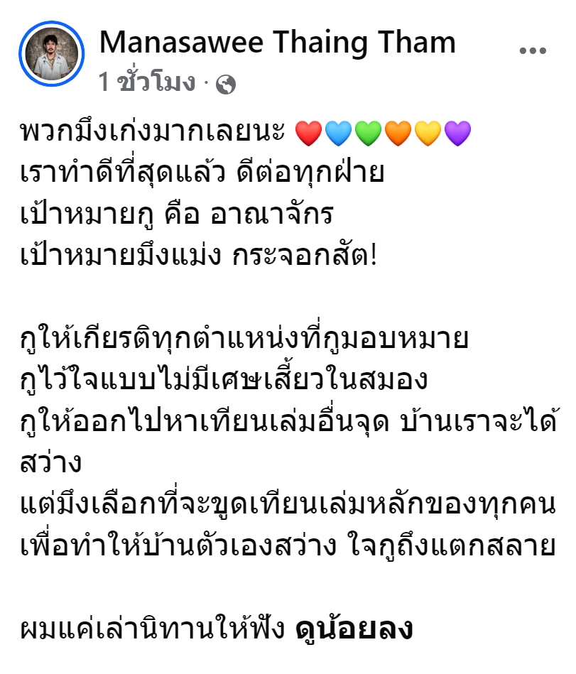 พวกมึงเก่งมากเลยนะ เราทำดีที่สุดแล้ว ดีต่อทุกฝ่าย เป้าหมายกู คือ อาณาจักร เป้าหมายมึงแม่ง กระจอกสัต! กูให้เกียรติทุกตำแหน่งที่กูมอบหมาย กูไว้ใจแบบไม่มีเศษเสี้ยวในสมอง กูให้ออกไปหาเทียนเล่มอื่นจุด บ้านเราจะได้สว่าง แต่มึงเลือกที่จะขูดเทียนเล่มหลักของทุกคน เพื่อทำให้บ้านตัวเองสว่าง ใจกูถึงแตกสลาย ผมแค่เล่านิทานให้ฟัง