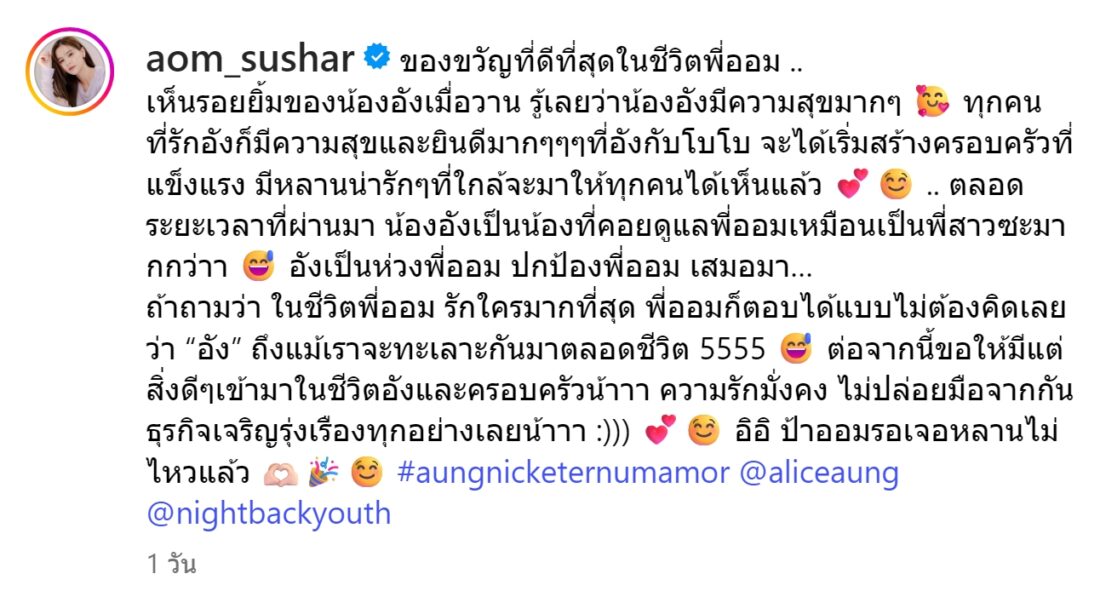 บรรยากาศอบอุ่นเต็มไปด้วยรอยยิ้ม เมื่อ น้องอัง น้องสาวสุดที่รักของนักแสดงสาว ออม สุชาร์ เข้าพิธีวิวาห์อย่างชื่นมื่น ท่ามกลางครอบครัวและเพื่อนสนิทที่ร่วมยินดีเพียบ