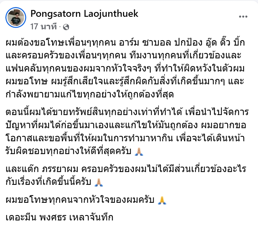 โดยล่าสุดได้มีการออกมาเคลื่อนไหวโพสต์ขอโทษทุกคนที่เกี่ยวข้องและเพื่อนๆว่า
