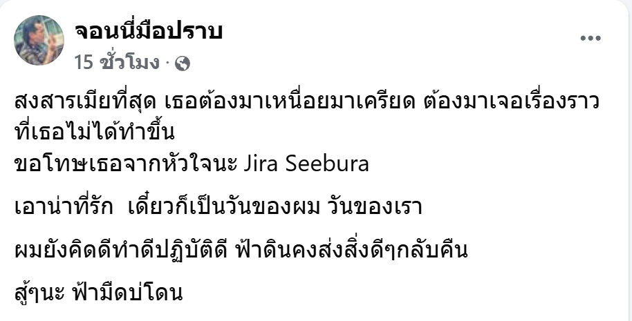 ล่าสุดได้ออกมาเปิดแชทขณะที่คุยกับภรรยา พร้อมแคปชั่นว่า สงสารเมียที่สุด เธอต้องมาเหนื่อยมาเครียด ต้องมาเจอเรื่องราวที่เธอไม่ได้ทำขึ้น ขอโทษเธอจากหัวใจนะ Jira Seebura เอาน่าที่รัก เดี๋ยวก็เป็นวันของผม วันของเรา ผมยังคิดดีทำดีปฏิบัติดี ฟ้าดินคงส่งสิ่งดีๆกลับคืน สู้ๆนะ ฟ้ามืดบ่โดน