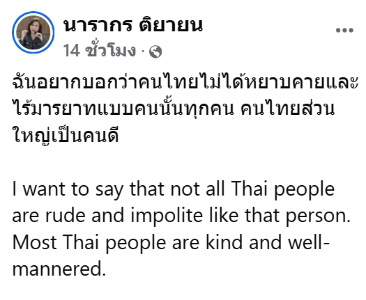ฉันอยากบอกว่าคนไทยไม่ได้หยาบคายและไร้มารยาทแบบคนนั้นทุกคน คนไทยส่วนใหญ่เป็นคนดี