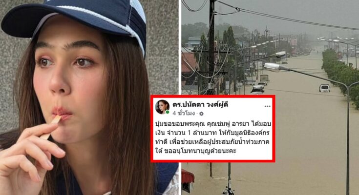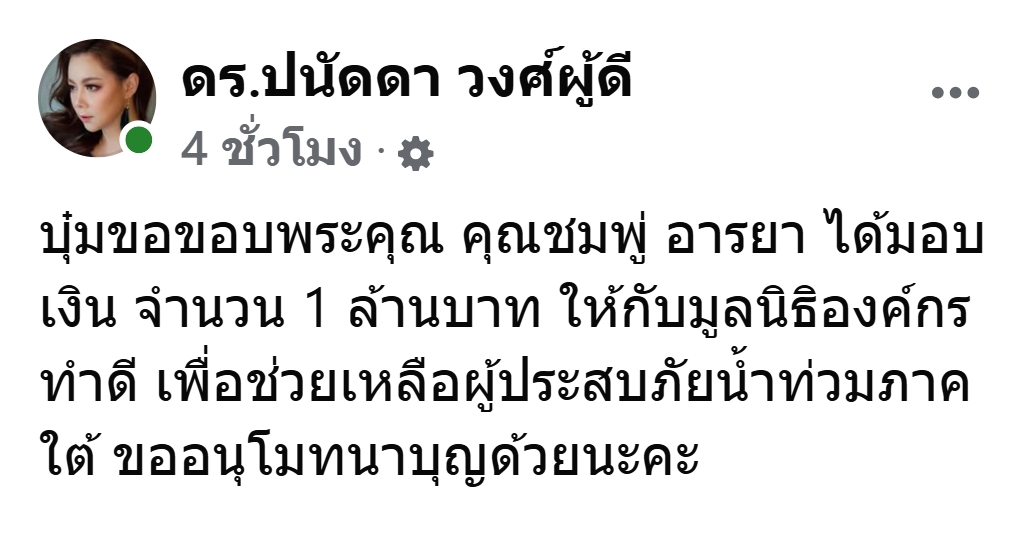 “บุ๋มขอขอบพระคุณ คุณชมพู่ อารยา ได้มอบเงิน จำนวน 1 ล้านบาท ให้กับมูลนิธิองค์กรทำดี เพื่อช่วยเหลือผู้ประสบภัยน้ำท่วมภาคใต้ ขออนุโมทนาบุญด้วยนะคะ”
