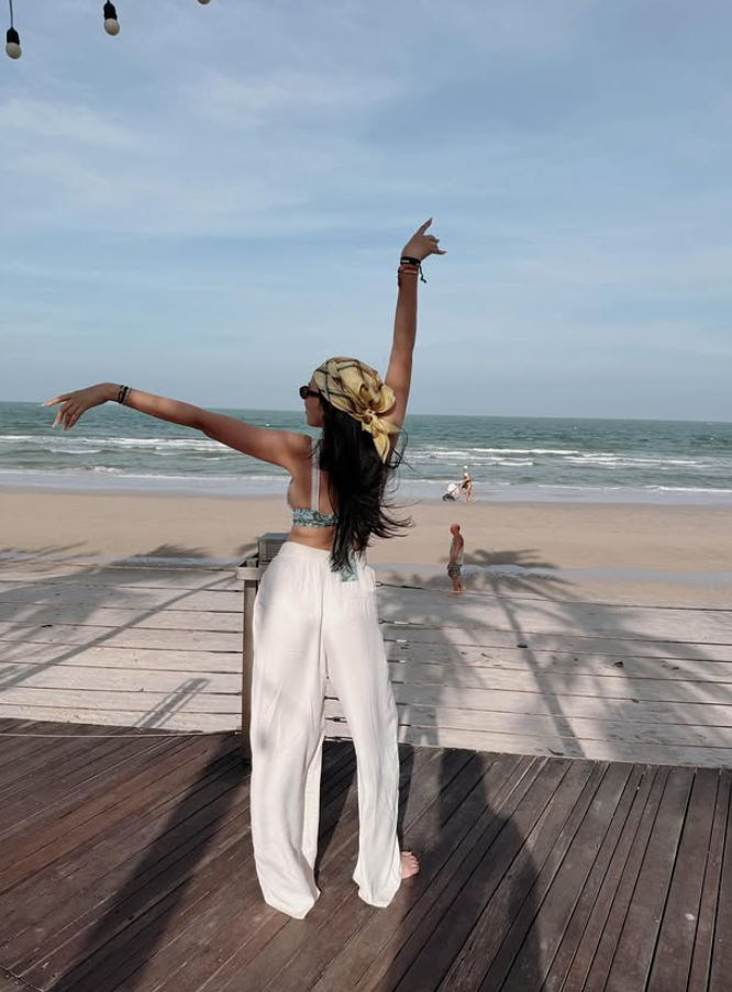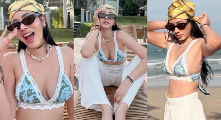 มาในลุคเซ็กซี่เบาๆ ที่ท่อนบนสวมบิกินี่ตัวจิ๋ว กางเกงสีขาว ยืนโพสท่ารับแสงแดดเบาๆ แต่ละช็อตมีความสวยเป๊ะปัง หุ่นแซ่บไม่เบาเลย