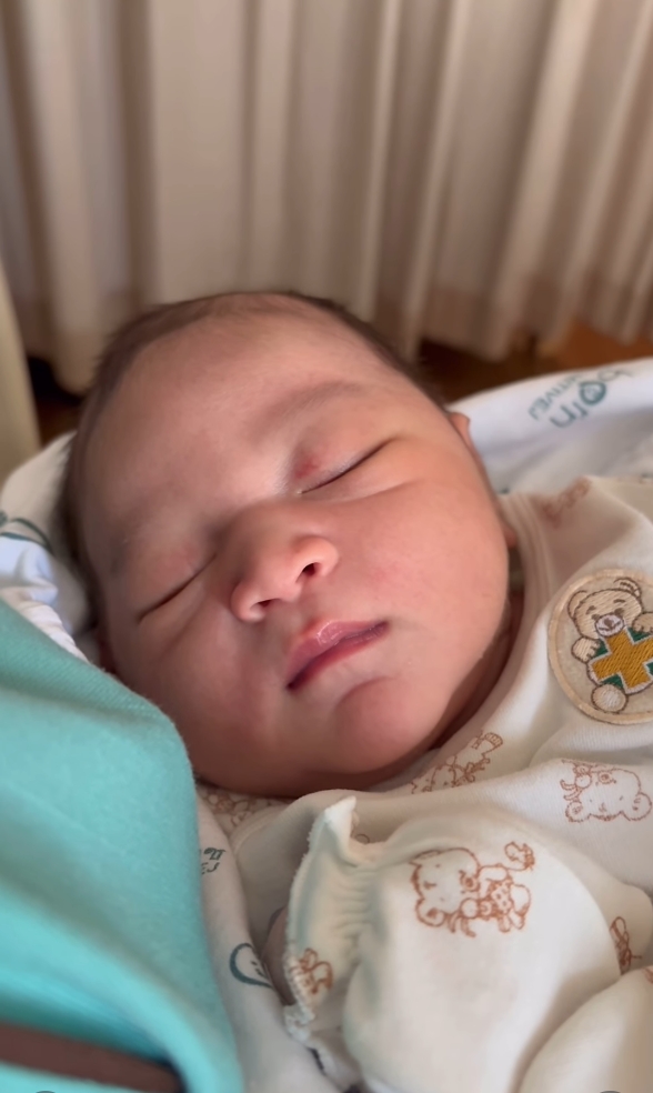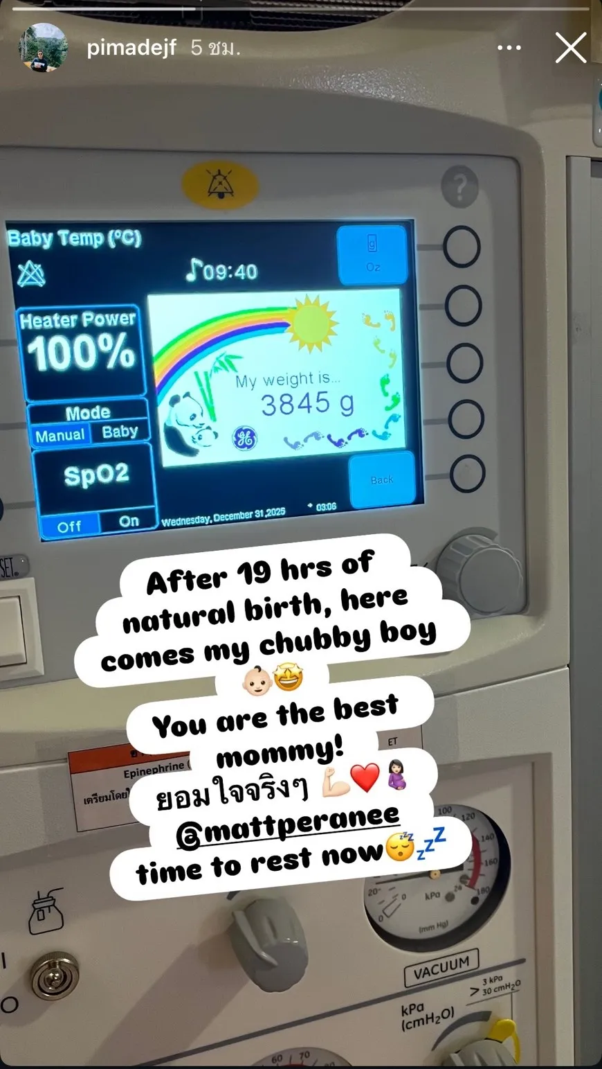 ข้อความจากสามี “After 19 hrs of natural birth, here comes my chubby boy. You are the best mommy! time to rest now zZZ” (หลังจากคลอดธรรมชาติมานานถึง 19 ชั่วโมง ในที่สุดลูกชายตัวจ้ำม่ำของผมก็ออกมาแล้ว คุณคือคุณแม่ที่เก่งที่สุดเลย! ได้เวลาพักผ่อนแล้วนะตอนนี้)