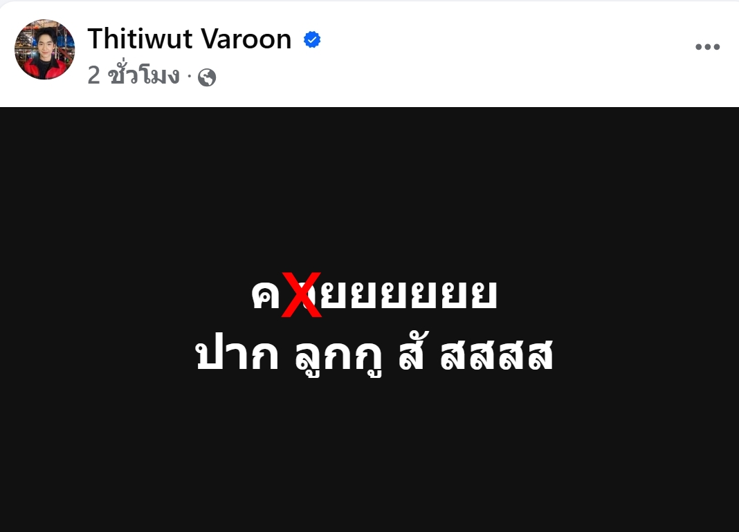 จับตามองอีกแล้ว! “บิ๊ก ธิติวุฒิ วารุณ” ออกมาโพสต์ข้อความเดือดผ่านโซเชียล โดยมีประโยคสั้นๆ จนแฟนๆ เข้ามาถามไถ่และเป็นห่วงกันจำนวนมาก แคปชั่น ค Xยยยยยย ปาก ลูกตรู สั สสสส