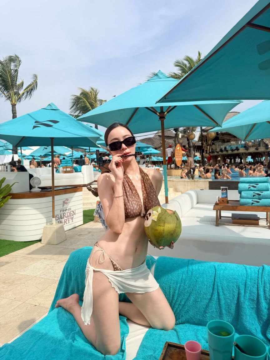 นิวเคลียร์มาในลุคบิกินี่คล้องคอลายจุดสุดเก๋ แมตช์กับผ้าคลุมสีขาวบางเบาช่วงล่าง ที่บอกเลยว่าแทบปิดความแซ่บไว้ไม่มิด! เพิ่มความคูลด้วยแว่นกันแดดสีดำ คอมพลีทลุคสาวมั่นที่ดูแลตัวเองได้ดีเยี่ยม
