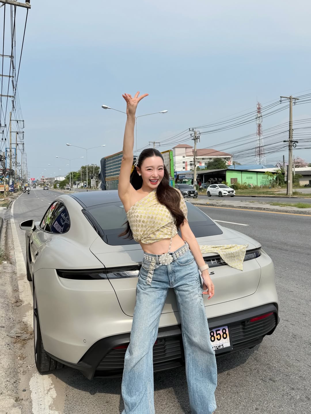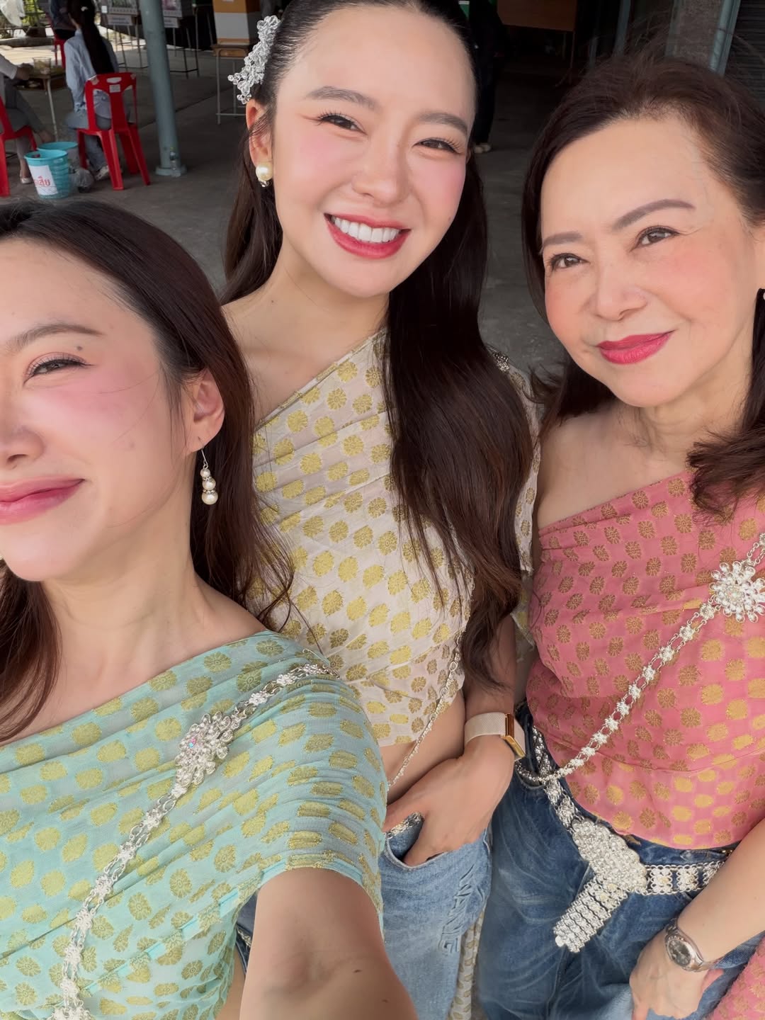 มายด์มาในลุคสวยหวานนุ่งสไบสีเหลืองทองอร่าม โชว์เอวเอสสุดเป๊ะ แมตช์กับกางเกงยีนส์เท่ๆ ขับผิวขาวออร่าให้ยิ่งดูผ่องใสสไตล์สาวไทยยุคใหม่ ควงคุณแม่ที่มาในสไบสีชมพูหวาน และน้องสาวในสไบสีเขียวพาสเทล บอกเลยว่าสวยสำเนาถูกต้องกันทั้งบ้านจนแยกไม่ออกว่าคนไหนพี่คนไหนน้องคนไหนแม่ อิอิ