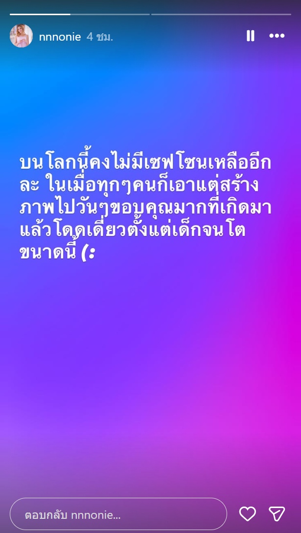 “บนโลกนี้คงไม่มีเซฟโซนเหลืออีกละ ในเมื่อทุกๆคนก็เอาแต่สร้างภาพไปวันๆขอบคุณมากที่เกิดมาแล้วโดดเดี่ยวตั้งแต่เด็กจนโตขนาดนี้ (:”