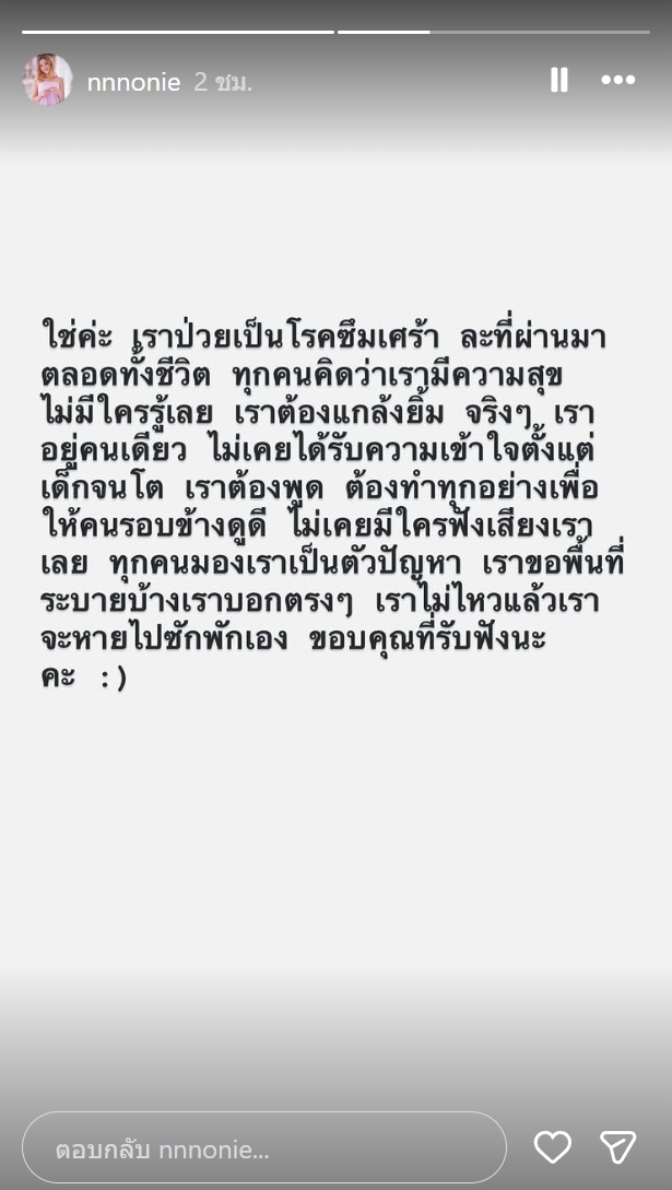 “ใช่ค่ะ เราป่วยเป็นโรคซึมเศร้า ละที่ผ่านมาตลอดทั้งชีวิต ทุกคนคิดว่าเรามีความสุข ไม่มีใครรู้เลย เราต้องแกล้งยิ้ม จริงๆ เราอยู่คนเดียว ไม่เคยได้รับความเข้าใจตั้งแต่เด็กจนโต เราต้องพูด ต้องทำทุกอย่างเพื่อให้คนรอบข้างดูดี ไม่เคยมีใครฟังเสียงเราเลย ทุกคนมองเราเป็นตัวปัญหา เราขอพื้นที่ระบายบ้างเราบอกตรงๆ เราไม่ไหวแล้วเราจะหายไปซักพักเอง ขอบคุณที่รับฟังนะคะ : )”