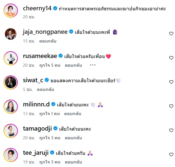 งานนี้ทำเอาเจ้าตัวและครอบครัวอยู่ในความโศกเศร้า ท่ามกลางแฟนคลับและเพื่อนในวงการที่ต่างเข้ามาร่วมแสดงความเสียใจ พร้อมส่งกำลังใจให้ เชียร์ ฑิฆัมพร กันอย่างต่อเนื่อง
