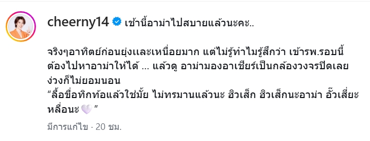 ทำเอาแฟนๆ ส่งกำลังใจกันล้นโซเชียล เมื่อ เชียร์ ฑิฆัมพร นักแสดงสาวชื่อดัง ออกมาแจ้งข่าวสุดอาลัยว่าได้สูญเสีย “อาม่า” ผู้เป็นที่รักไปอย่างไม่มีวันกลับ