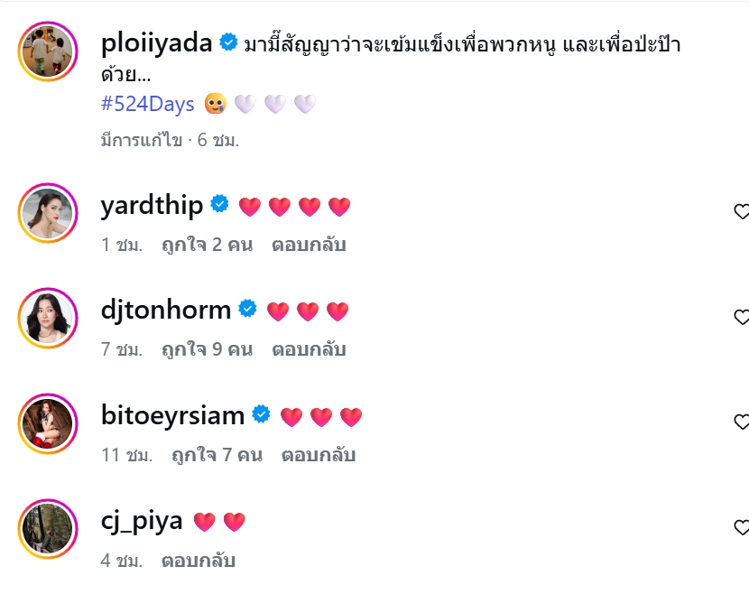 พร้อมเขียนแคปชั่นชวนสะเทือนใจว่า “มามี๊สัญญาว่าจะเข้มแข็งเพื่อพวกหนู และเพื่อป่ะป๊าด้วย… #524Days” บ่งบอกถึงความเข้มแข็งและความรักที่มีต่อลูกๆ