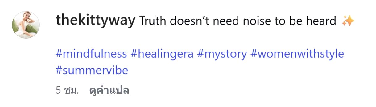 ล่าสุดมีรายงานว่า ทางด้านอดีตภรรยาอย่าง “คิตตี้” ก็เคลื่อนไหวผ่านโซเชียลทันที แคปชั่นภาษาอังกฤษสั้นๆ แต่ความหมายสุดลึกซึ้งว่า “Truth doesn’t need noise to be heard” หรือแปลเป็นไทยว่า “ความจริงไม่จำเป็นต้องส่งเสียงดังเพื่อให้คนได้ยิน” งานนี้ทำเอาชาวเน็ตหูผึ่งและตีความกันไปต่างๆ นานา