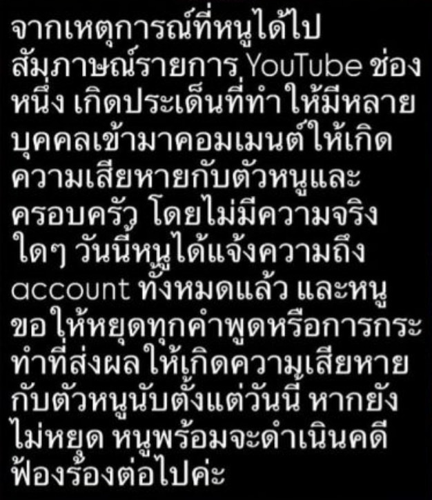 “จากเหตุการณ์ที่หนูได้ไปสัมภาษณ์รายการ YouTube ช่องหนึ่ง เกิดประเด็นที่ทำให้มีหลายบุคคลเข้ามาคอมเมนต์ให้เกิดความเสียหายกับตัวหนูและครอบครัว โดยไม่มีความจริงใดๆ วันนี้หนูได้แจ้งความถึง account ทั้งหมดแล้ว และหนูขอให้หยุดทุกคำพูดหรือการกระทำที่ส่งผลให้เกิดความเสียหายกับตัวหนูนับตั้งแต่วันนี้ หากยังไม่หยุด หนูพร้อมจะดำเนินคดีฟ้องร้องต่อไปค่ะ”