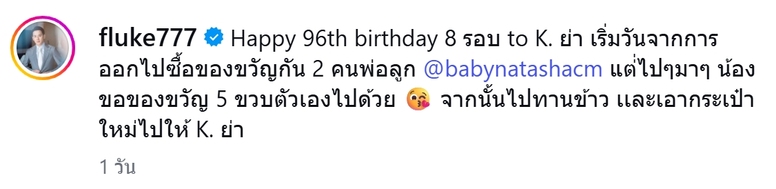 โดย “ฟลุค” เขียนข้อความว่า “Happy 96th birthday 8 รอบ to K. ย่า เริ่มวันจากการ ออกไปซื้อของขวัญกัน 2 คนพ่อลูก @babynatashacm แต่ไปๆมาๆ น้องขอของขวัญ 5 ขวบตัวเองไปด้วย จากนั้นไปทานข้าว และเอากระเป๋าใหม่ไปให้ K. ย่า “
