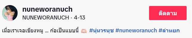ล่าสุดเจ้าตัวอินกับซีรีส์กระแสดังอย่าง ล่าหยก แบบสุด ๆ พอมีโอกาสได้ไปเดินตลาดและเจอเขียงหมูเข้า งานนี้นุ่นก็ไม่พลาด หยิบโมเมนต์ตรงหน้าเขียงมาแปลงเป็นคอนเทนต์ทันที ออกมาโชว์สเต็ปเต้นแบบสดใส จนแฟนคลับเข้ามากดไลค์และคอมเม้นท์กันสนั่น