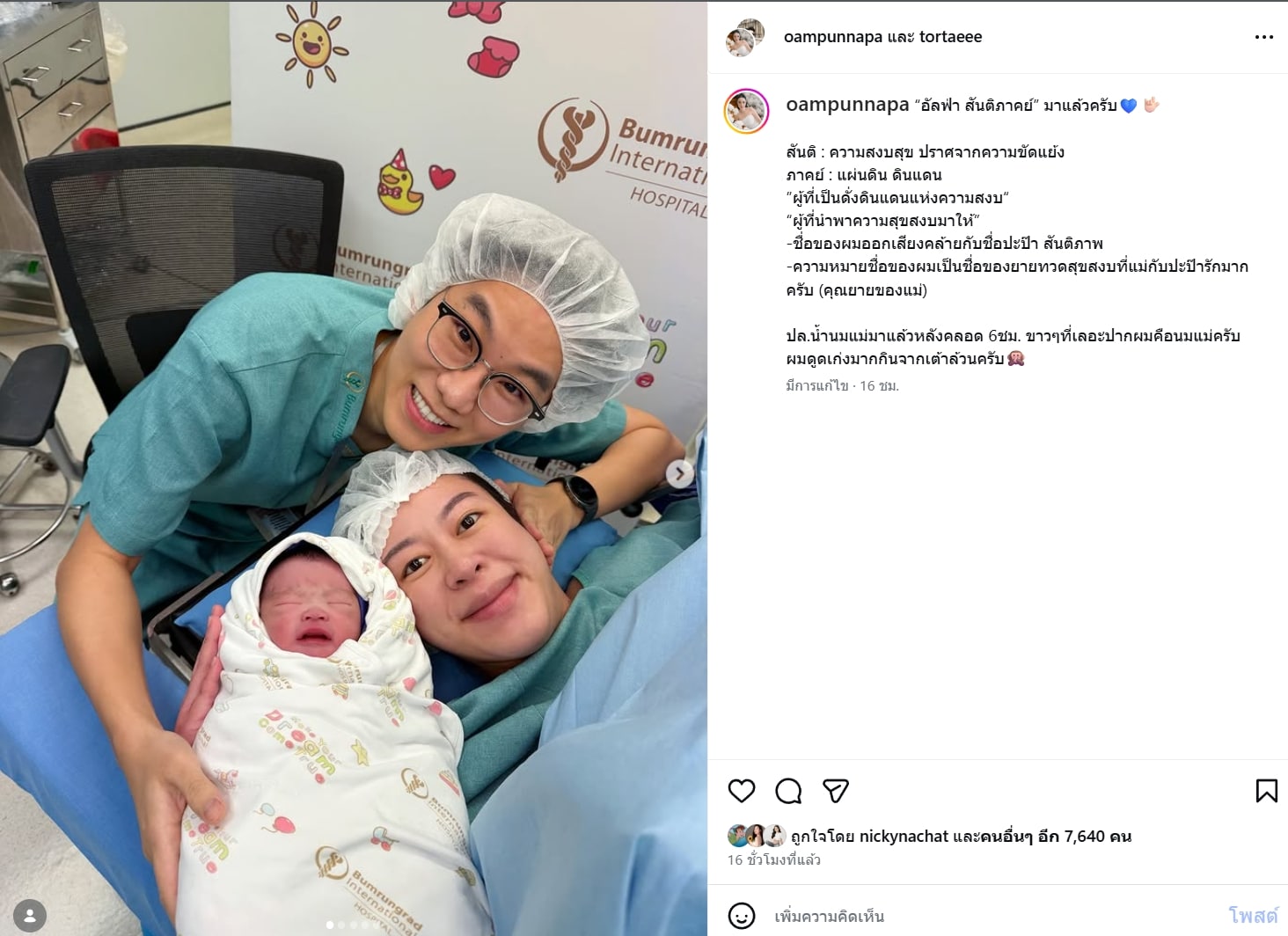 ข่าวดีของครอบครัวมาแล้วจ้า เมื่อ “อ้อม ปุณณภา” พี่สาวของ “เอวา ปวรวรรณ” ให้กำเนิดลูกคนแรกเป็นที่เรียบร้อย ท่ามกลางบรรยากาศสุดอบอุ่นในห้องคลอด พร้อมภาพครอบครัวที่เห็นแล้วใจฟูสุดๆ โดยอ้อมได้โพสต์ภาพแรกของลูกน้อย พร้อมคุณพ่อคุณแม่แบบพร้อมหน้าพร้อมตา และเขียนแคปชั่นประกาศข่าวดีว่า “อัลฟ่า สันติภคย์ มาแล้วครับ”