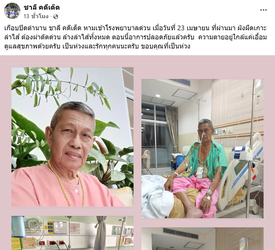 “ชาลี คดีเด็ด” ระบุว่าเกิดจากอาการ “ผังผืดเกาะลำไส้” ซึ่งรุนแรงถึงขั้นต้องเข้ารับการผ่าตัดด่วนเพื่อล้างลำไส้ทั้งหมด โดย “น้าชาลี” ได้โพสต์เตือนสติทุกคนว่า “ความตายอยู่ใกล้แค่เอื้อม” และอยากให้ทุกคนหันมาดูแลสุขภาพกันให้ดี